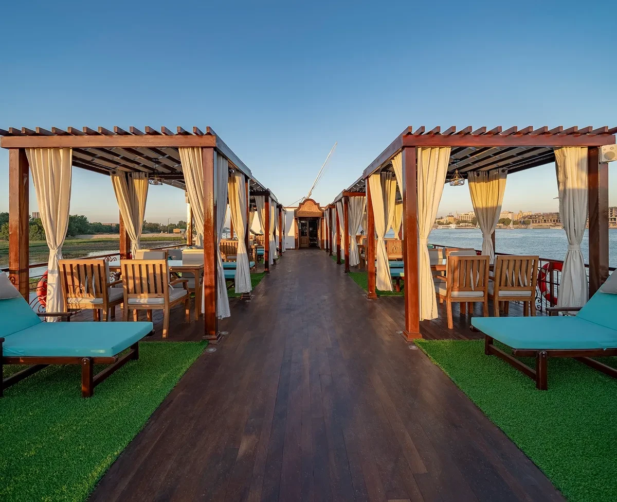 Step onto our elegant sundeck and embrace the height of relaxation and luxury as the timeless beauty of the Nile stretches before you. Bathed in warm sunshine and accompanied by the gentle rhythm of the river, every moment becomes a perfect blend of serenity, comfort, and unforgettable bliss.